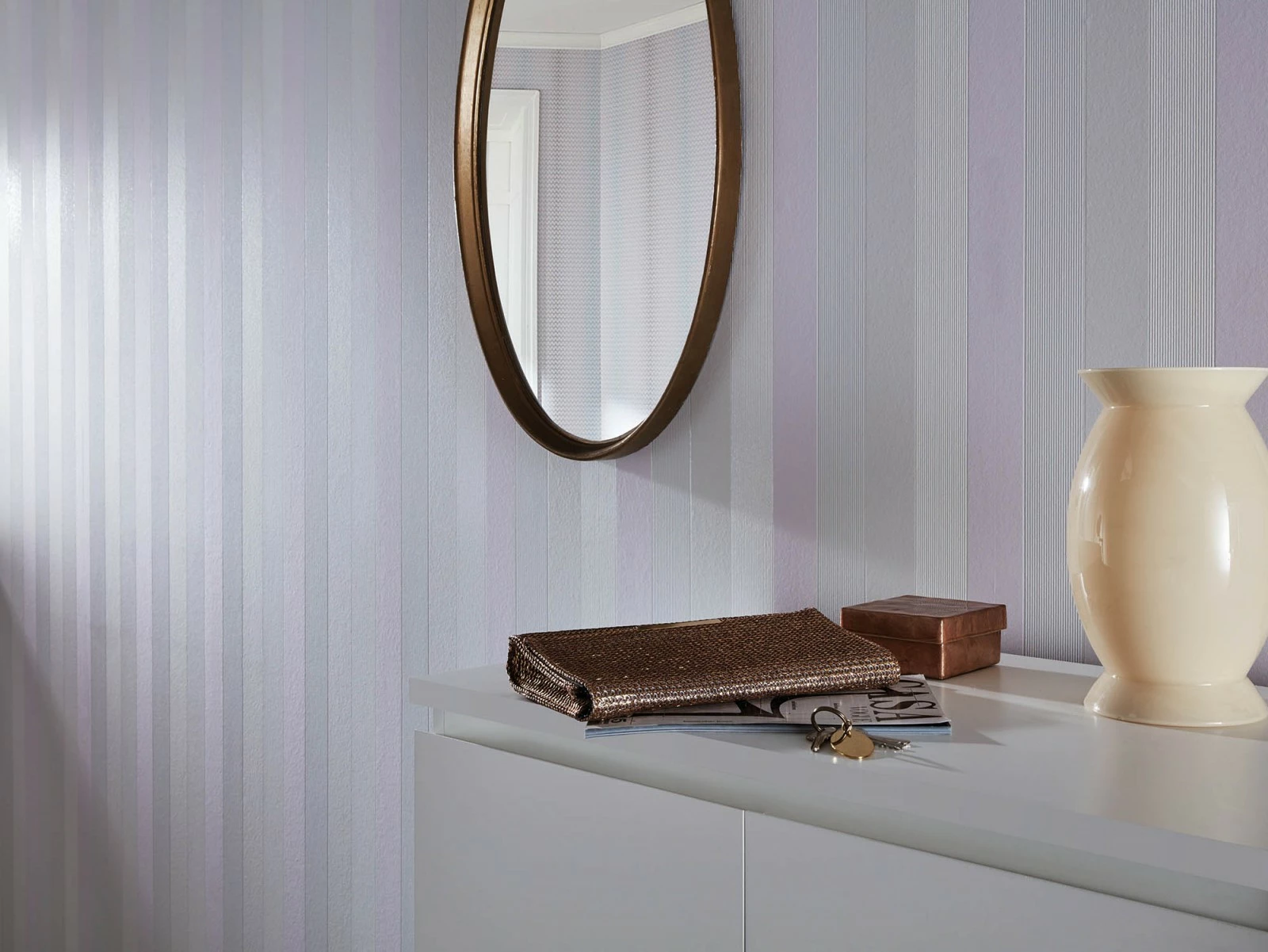 Die Guido Maria Kretschmer Tapete 13365-10 ist den Themenwelten Loft und Elegance zugeordnet und lässt ein harmonisches Raumgefühl entstehen. Das flieder- und weißfarbige Streifenmuster gibt dem Tapetendesign einen klassisch eleganten Charakter und stattet Wohnräume mit einem eleganten Loft-Look aus. Dabei überzeugt die Designertapete von Guido Maria Kretschmer nicht nur mit einem prachtvollen Design, sondern auch mit hervorragenden Materialeigenschaften. Die Tapete ist hoch waschbeständig, gut lichtbeständig und lässt sich wieder restlos trocken von der Wand entfernen.