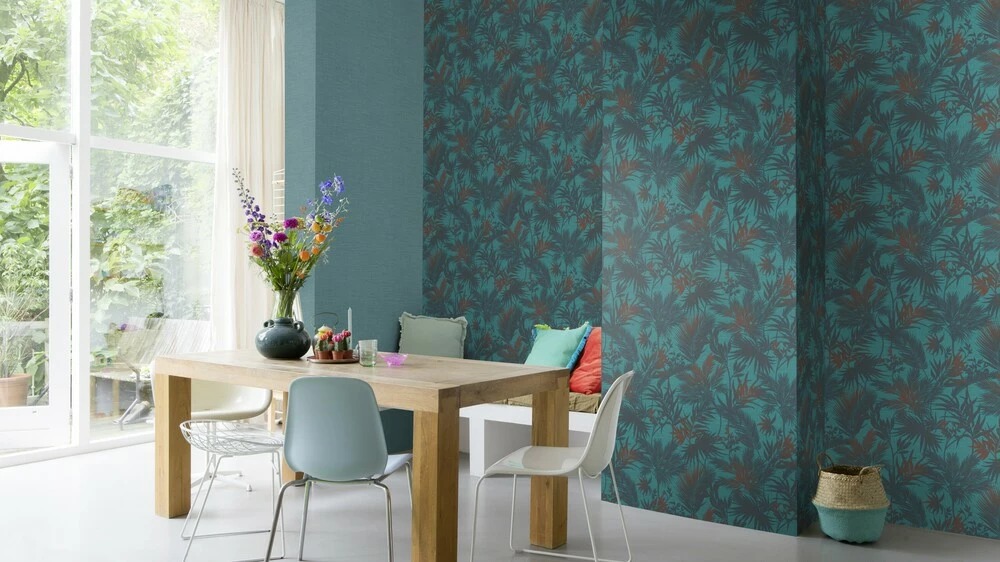 Die Tapeten von Rasch aus der Kollektion „Kalahari“ bringen sofort Ruhe und Geborgenheit in deine eigenen vier Wände. Die natürlichen Muster wirkt wohnlich und passen sich deinem Interieur perfekt an. Die Vliestapete 704143 mit Blätter im Dschungel in türkis-blau, anthrazit und Metallic-Effekt sorgt für ein warmes Lebensgefühl und lädt zum Entspannen ein.