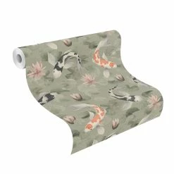 Tapete Vlies Rasch Seerosen Koi Fisch grün rosa weiß Kimono 409437