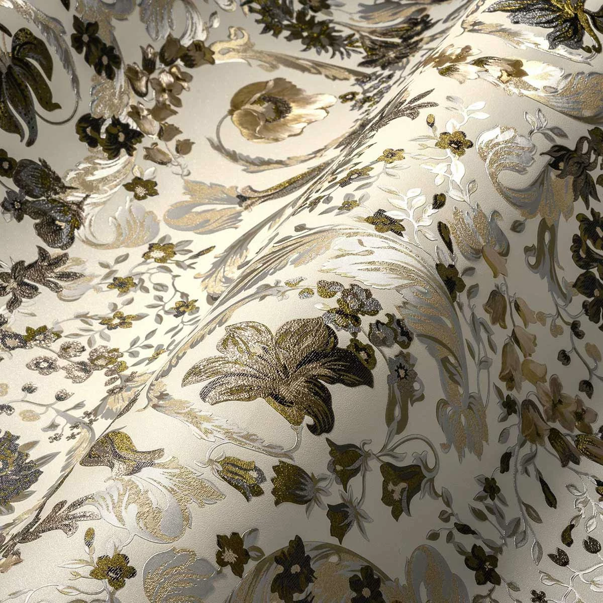 Mit den Vliestapeten der Versace Home 5 Kollektion bringen Sie den einzigartigen Stil der Luxusmarke Versace an Ihre Wände. Die Tapeten zeigen typische Versace Motive wie Medusaköpfe oder Mäandermuster. Aber auch schlichte Uni-Tapeten können Sie hier finden. Die Tapete 38706-6 in Cremeweiß mit Metallic-Effekten in Gold und Silber, sowie Glitzer mit metallischen Akzenten besticht durch ein edles Blumenmuster. Lassen Sie sich von den Versace Home Tapeten überzeugen und entdecken Sie die komplette Kollektion bei uns im Shop.