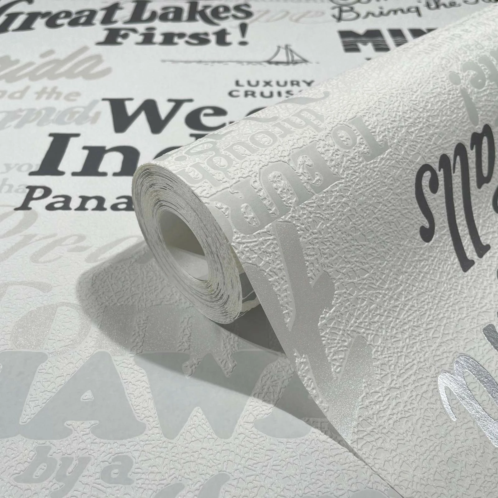 Vliestapete 82327 aus der Kollektion Ivy von Novamur mit Schriftzügen mit Struktur in weiß grau mit Metallic Effekt in Silber